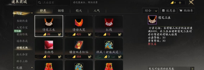 完成各种任务完成之后就可以领取到结婚证了,后续还有环节,例如花轿送喜和百年好合等。这两项都是额外付费的服务。可以根据选择的花轿种类,提供一定的金钱及选择路线。百年好合需要直接消耗金币和可抽取物品,然后让其他的玩家去抽红包。