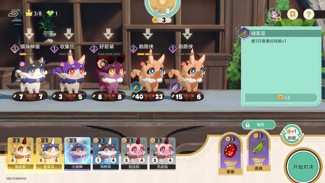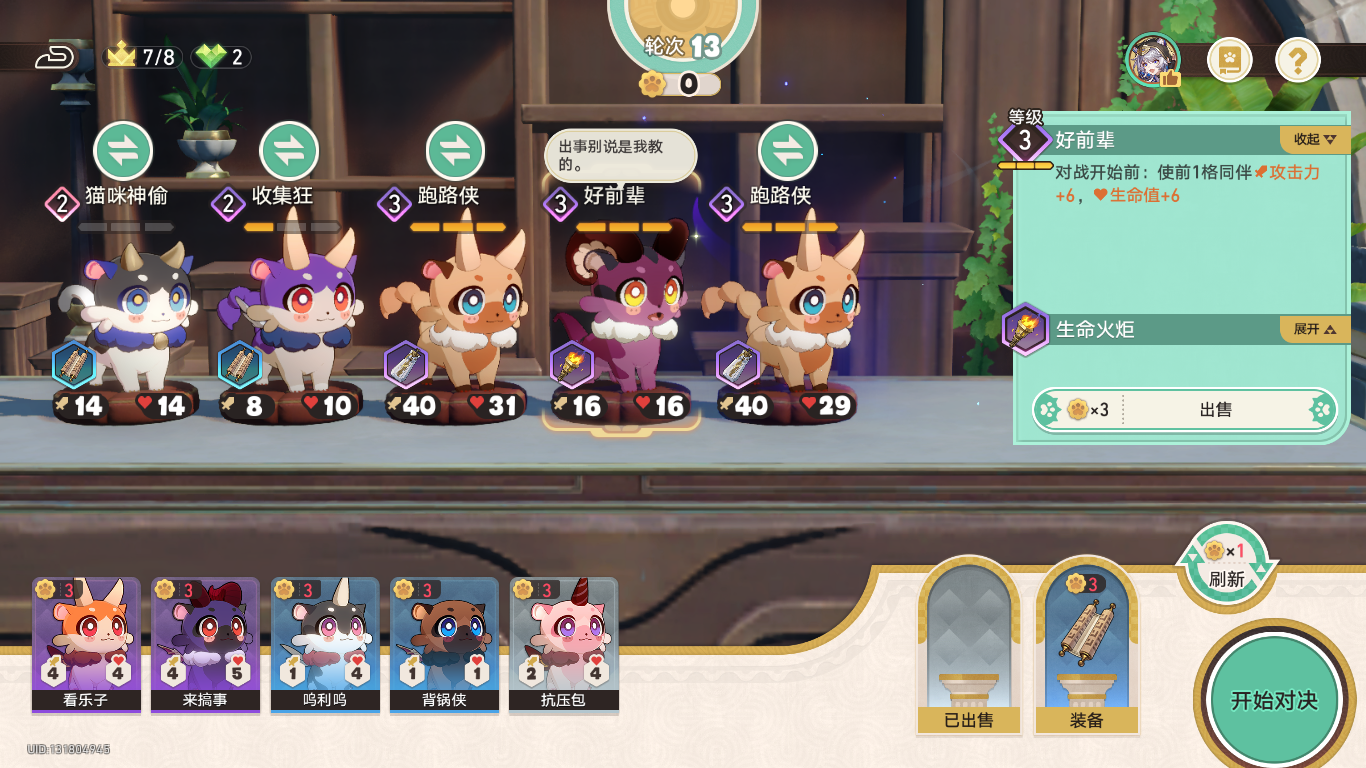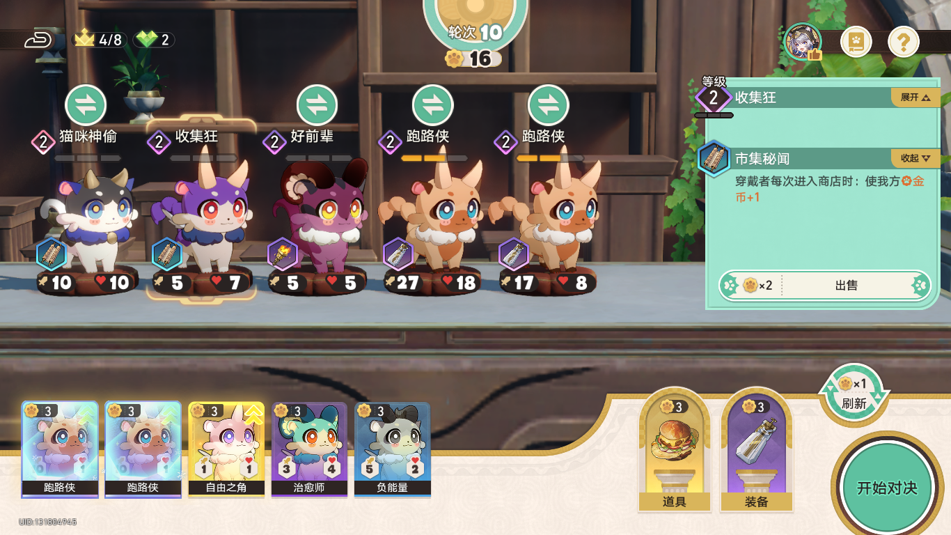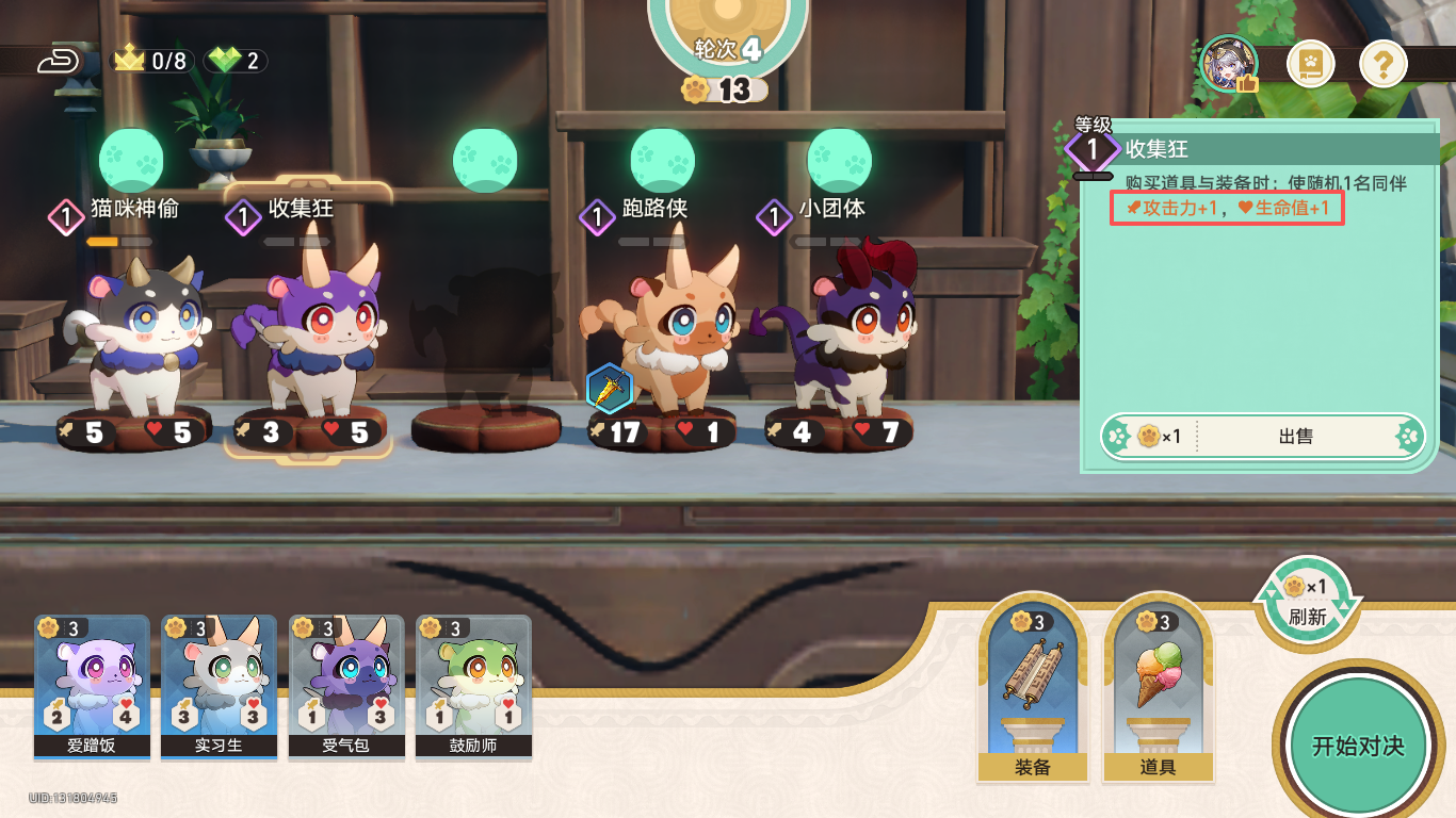 在刷新的过程中如果拿到【收集狂】及时上阵,购买道具就随机给我方一个奇美拉永久可以增加攻击力和生命值