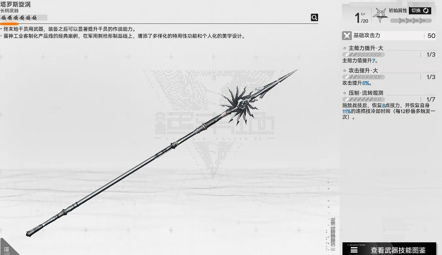 接下来为大家介绍的就是塔洛斯漩涡,这在当前是属于一个非常不错的长炳武器,它在基础的攻击能力上面可以造成的能力数值提升7%之后,攻击能够达到6%的提升,在压制流转观测这个技能效果上面,可以让他在使用自身站立的时候有足够的精力恢复,精力在8点恢复了之后,可以给他恢复自身11%的冷却时间,当然了这个冷却加速是只能体现在连接器的使用效果上面,每12秒的情况下,这个技能最多触发一次,虽然这个武器技能在使用的情况下,中间需要达到的冷却时间比较多,但是能够给角色恢复记忆的武器还是非常少的,所以放在这里的话能够使用的空间也比较大。