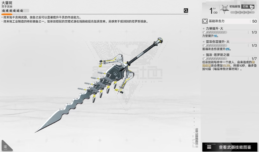 而且在这里大家可以使用的武器类别来根据这里选定的话,也有各种不同的武器技能效果可以使用,第一个为大家推荐的是昔日精品,在当前效果上面,作为一个双手类型的武器可以提升到的主动能力还是非常大的,而且根据终极的能量效率增加之后,大家可以用他的切碎疗法做一个技能效果,在利用武器造成了治疗效果之后,可以额外让其中的恢复目标带来装备5%最大生命值的回复,此时进行治疗的话,可以使敌人也就是装备他的角色,在10秒内攻击能力上面增加6%,每一个干员装备他的情况下,30秒之内都可以获得一次这样的治疗,所以在此进行一些治疗支撑的话,这个武器还是不错的。
