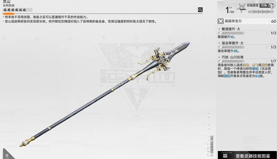 接着为大家介绍的就是这个负山,在当前装备了之后,对于角色的敏捷提升达到了10%的效果,而且在暴击概率上面也提到了5%,这还是一个初始的百分比,所以后期才达到了等级切换之后,它能够达成的数值会比这个更高一些,同时能够触发的技能叫做山川在我,利用这个武器可以带来的技能是造成倒地或者是击飞这类效果的话,会让敌人在持续10秒的时间之内有一个标记,这个标记虽然不能进行附加,但是在装备者用重击攻击这类效果标记的敌人当中,可以消耗他的标记层数能够达到五倍的伤害数值进行积累。