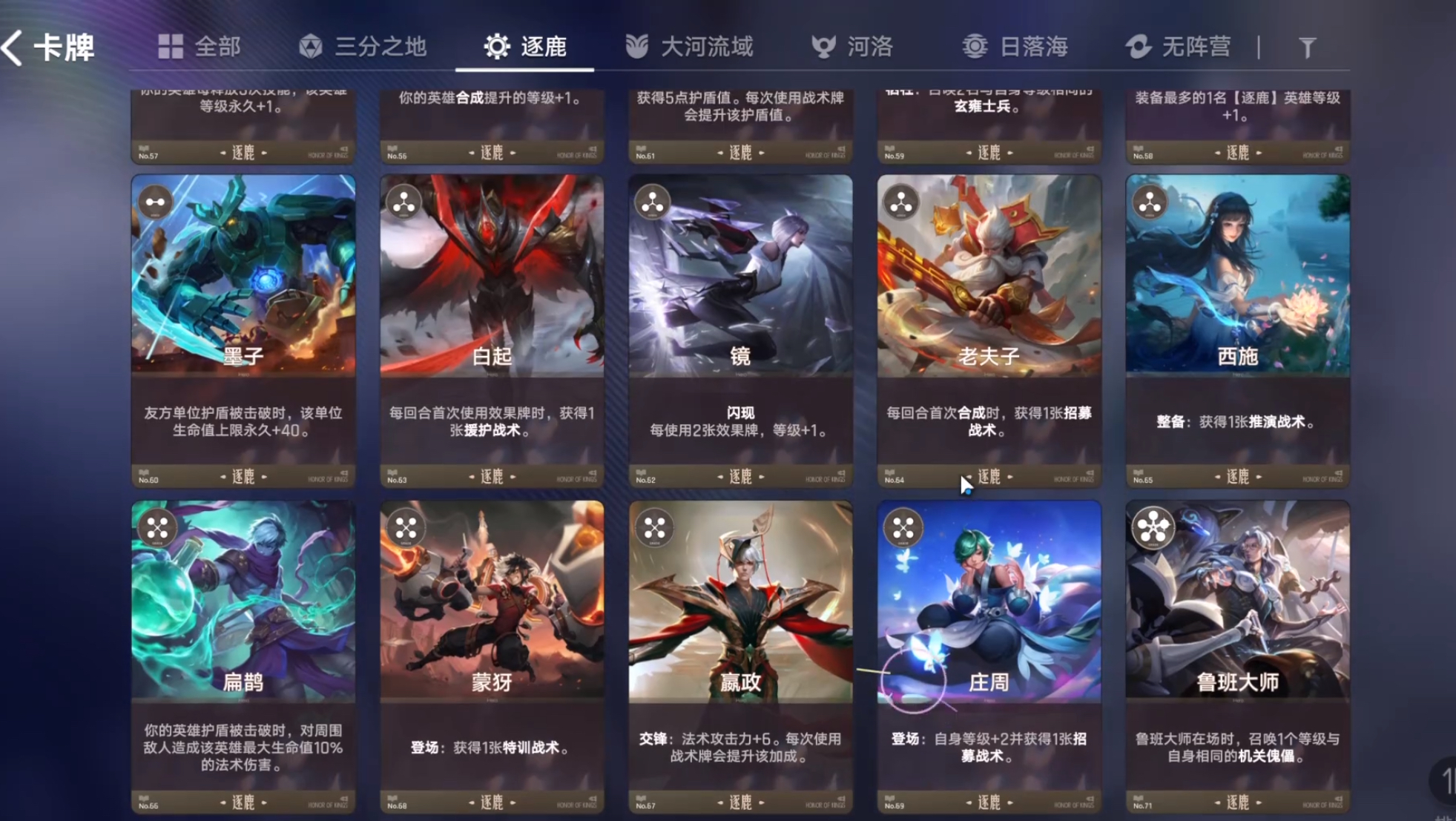 逐鹿合成流的关键思路就是通过高频的合成和使用效果牌来提升棋子们的等级,以此来增加我们整体的战斗能力。首先是棋手的选择,因为我们主要依靠的合成,所以棋手这里推荐使用白歌,他的神来之笔效果是每进行四次英雄合成的话就会获得一张“即兴创作”,而这个“即兴创作”的效果则是可以随机复制场上的一位英雄。开局的话我们尽量不要去升级,多拿棋子就可以了,装备上有什么上什么就可以了。