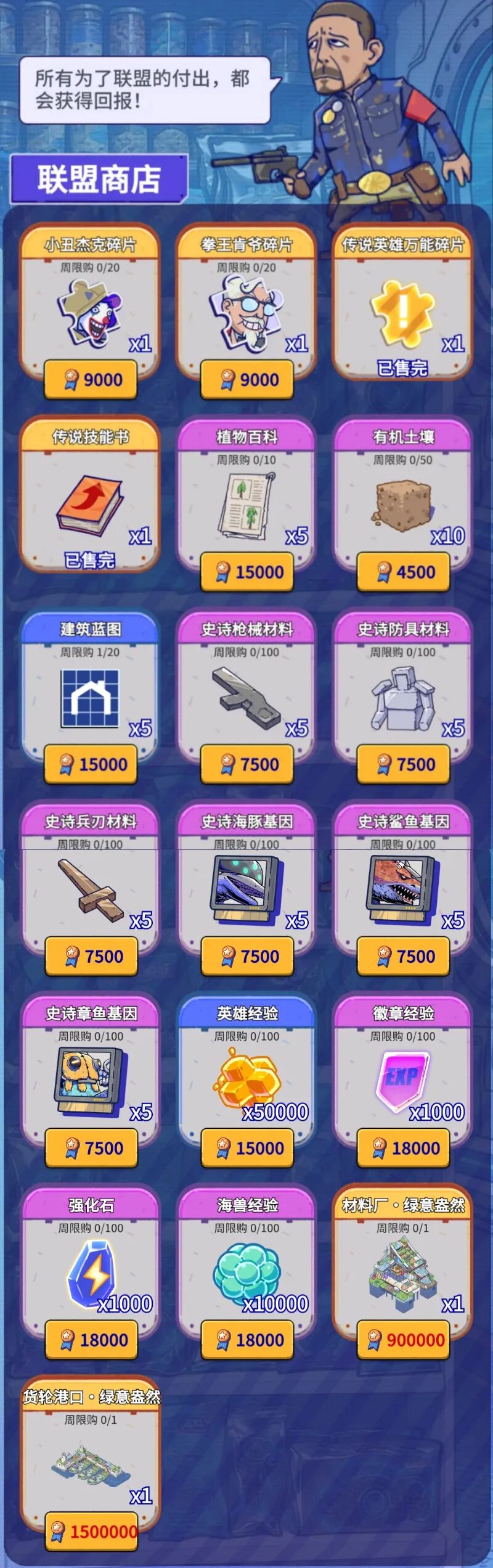 《疯狂水世界》联盟商店优先每周必换【传说万能碎片】与【传说技能书】。随后可积攒功勋,用以兑换底部两款价值68元的限定皮肤(S1赛季勤快即可白嫖)。其他如小丑等英雄碎片,若非培养目标则不推荐,植物百科与建筑蓝图可按需换取。