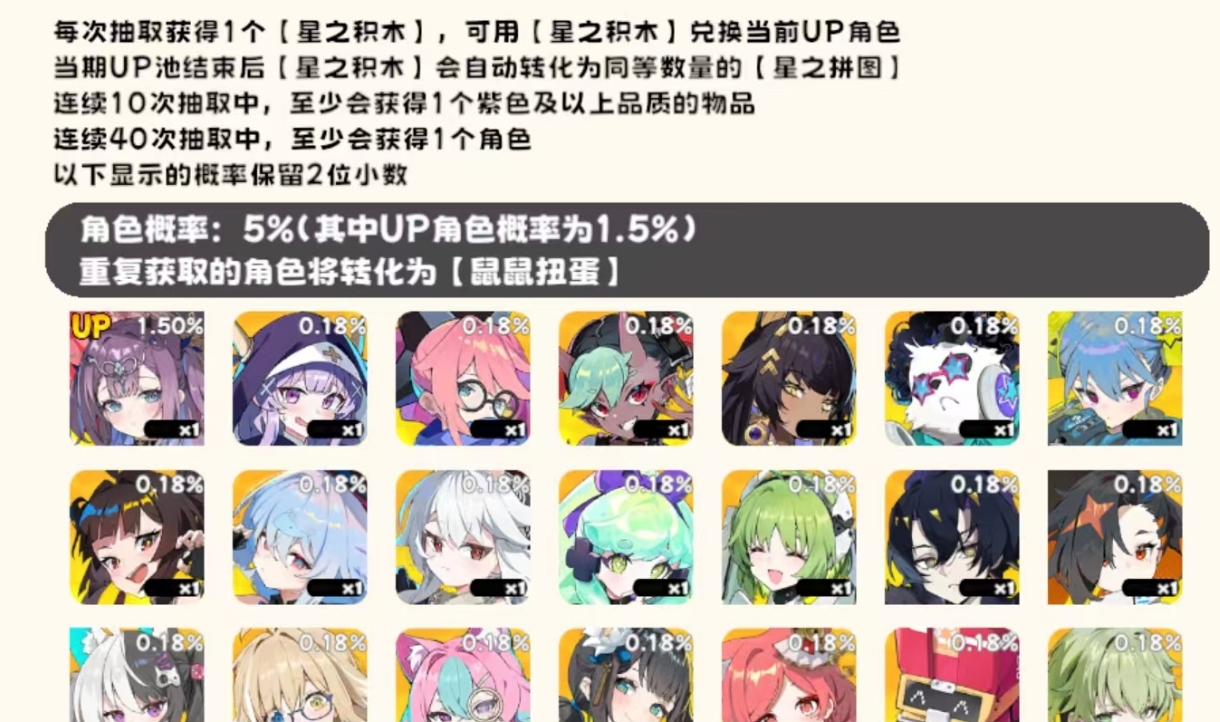 关键机制说明:UP池仅提升对应角色基础概率,不触发强制补偿机制;且星之积木具有时效性——UP池结束时,未使用的星之积木将自动转化为星之拼图,无法跨池继承。因此,建议玩家在确认拥有至少100次抽卡机会后再开启UP池抽取。即使前100抽未命中目标角色,仍可用累计的100枚星之积木直接兑换。若同期开放多个UP池,且玩家对其中两名以上UP角色均有需求,可采取分阶段策略:先在首个UP池达成目标并保留剩余积木,再于第二个UP池中补足至100枚,即可零风险兑换第二名UP角色,实现资源利用最大化。