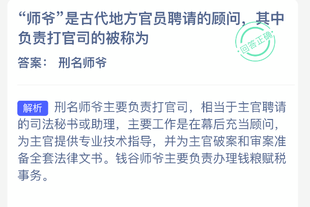 “师爷”是古代地方官员聘请的顾问,其中负责打官司的被称为?【蚂蚁新村每日一题】2026年1月8日题目已发布!坚持答题,积累木兰币,即可加速小镇建设。答对本题,立即可享“产速+3/时”的加速奖励!今天正确答案是【刑名师爷】。师爷是古代地方官员聘请的顾问,其中负责打官司的被称为刑名师爷。