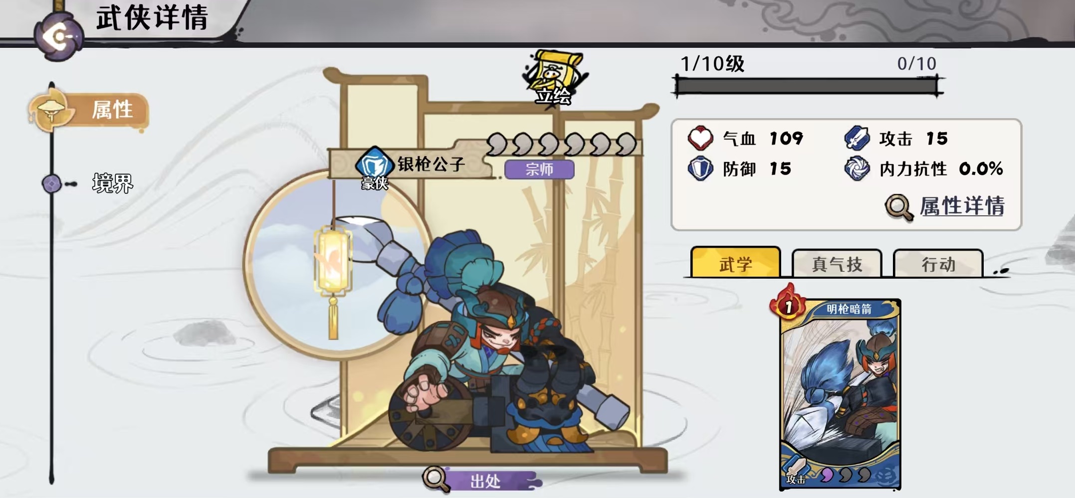 其核心武学“幻方八渊决”可在触发时为友方武侠发现各一张无形武学牌;同时,手牌中每存在一张中立牌,该技能怒气消耗即降低1点,最多减少3点;且于回合开始时自动返回手牌,保障持续可用性。真气技能则在行动开始时恢复1点真气,并允许免怒气打出两张怒气消耗大于1的少年技巧牌;若实际打出数量不足,则按缺失张数补发对应数量的无形少年技巧牌(每缺1张即发现2张);战斗开始时真气自动回满。这一机制使其成为水系技巧流体系中的启动枢纽,兼具续航调控、资源补充与战术容错能力。二命后实现质变,无论在推图开荒还是高难幻境中均具备广泛适配性。