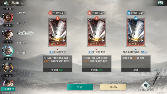 技能配置方面,黄忠主技能首选“白虹贯日”——该技能可对所在横排最末单位造成高额单体伤害,与天赋形成后排定点清除闭环;追击技同样选用“白虹贯日”,可额外提升10%暴击率,并附加三段随机单体攻击;被动技亦推荐此技能,进一步叠加20%暴击率,显著强化黄忠作为核心C位的瞬时爆发阈值。