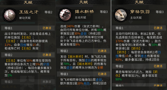 天赋协同是该队爆发力的核心支撑。荀彧天赋“王佐之才”为黄忠提供11%攻击力与防御力加成,并同步提升四项基础属性各15点;张飞天赋可对敌方施加“虚弱”与“易伤”双重减益,既削弱对手输出,又放大我方伤害;而黄忠自身天赋具备精准打击敌方后排单位的机制,与整体战术定位高度契合。
