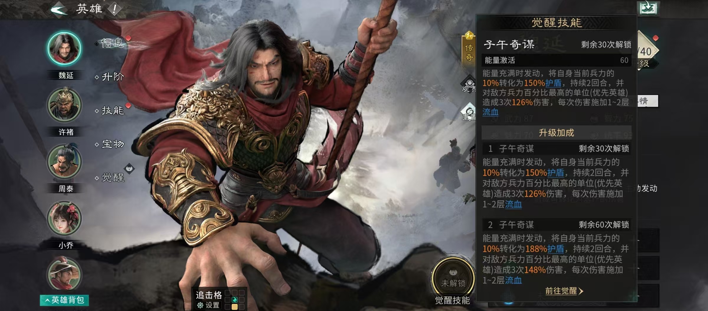觉醒技能【子午奇谋】进一步强化其持续压制能力:该技能可将魏延当前兵力的10%转化为护盾,并对敌方兵力百分比最高的单体目标连续发动三次独立伤害,每次命中均可独立施加流血效果。这一设计使其能快速在敌方主力单位身上叠加多层流血,配合天赋与倒戈机制,构建起稳定的“行动前掉血”节奏。因此,魏延在当前环境中被广泛视为“持续流血体系”的关键支点,同时也是以拼点、追击为核心逻辑的阵容天然反制者。