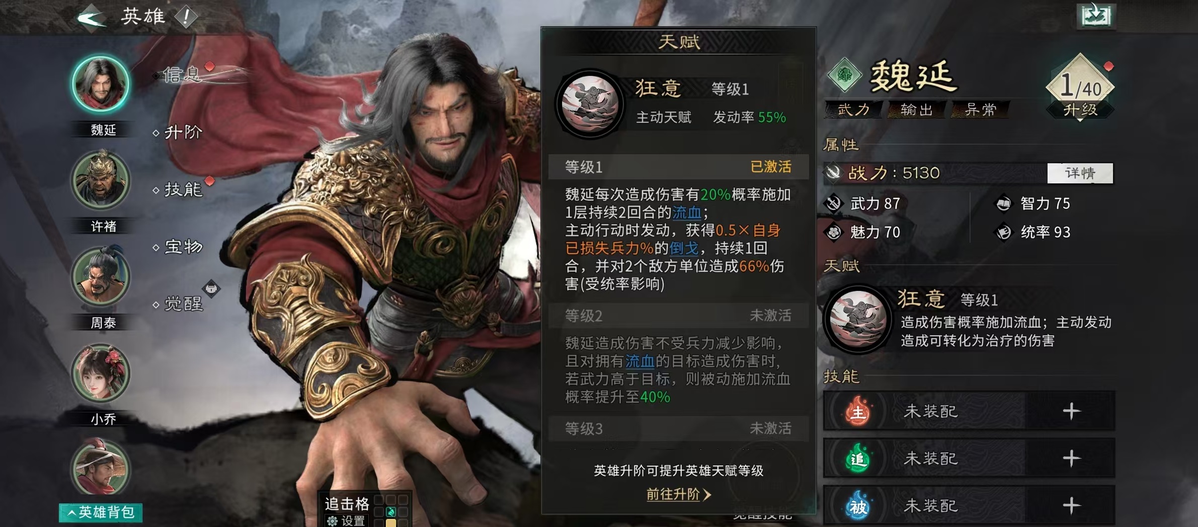 魏延的核心机制围绕“流血”展开:其天赋效果为每次造成伤害时,有固定概率对目标施加流血状态;处于流血状态的目标,将在每次行动开始前承受一次基于魏延武力值的持续伤害。此外,魏延在主动行动时可触发倒戈效果——成功造成伤害后,不仅恢复自身生命值(吸血),还会额外对两名敌方单位发动直接伤害。值得注意的是,魏延所造成的全部伤害均不受兵力衰减影响;当其武力值高于带有流血状态的目标时,被动触发流血的概率进一步提升,形成正向循环。