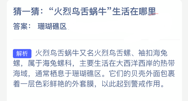以上就是猜一猜:“火烈鸟舌蜗牛”生活在哪里?神奇海洋今天答案最新2026年1月9日分享,更多相关攻略内容,请点击关注3DM手游网更新!