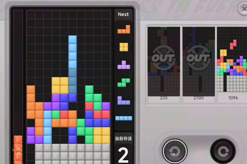 进入街机厅后,系统将随机分配当前可玩项目,首推玩法为复刻版《俄罗斯方块》。操作仅需两个基础按键:旋转与移动,用于调整下落方块的姿态与位置。每消除一行即可获得对应积分,界面实时显示各玩家当前得分与消行总数。本模式采用生存淘汰制——随着难度逐步提升,方块下落速度持续加快,坚持时间越长,最终评分越高,排名越靠前。