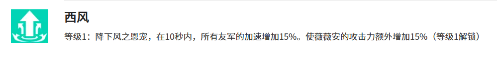 西风算是薇薇安的团队增益技能了。释放之后10秒内全队加速提升15%,薇薇安自己还能额外获得15%攻击力。41级变成17.5%双加成,141级直接拉到20%,而且薇薇安自己还多获得10%加速。这个技能在团战或者打副本的时候作用特别明显,开团之前先放一个西风,整个队伍的机动性和输出能力都会有质的飞跃。