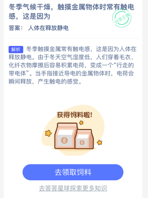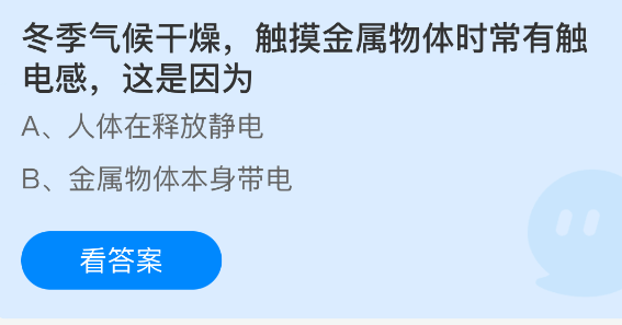 冬季气候干燥,触摸金属物体时常有触电感,这是因为?支付宝小鸡课堂开课啦!每天花一分钟答题赚饲料,喂喂小鸡就能贡献爱心啦!轻松又意义十足!2026年1月11日蚂蚁庄园的小鸡课堂题目正确答案是【人体在释放静电】,冬季触摸金属常有触电感,这是因为人体在释放静电。