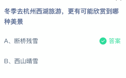 以上就是冬季去杭州西湖旅游,更有可能欣赏到哪种美景,支付宝蚂蚁庄园2026年1月12日答案最新,更多精彩内容,请点击关注3DM手游网更新!