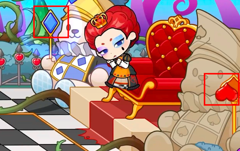 接下来进入到了第二步,前往大头王后身边,可以看到在它两侧的小熊石像上有两个权杖,之后根据权杖上的形状,将对应的红蓝宝石镶嵌在其中,这样玩家就可以成功激活石像,此时就能够开启魔法时钟。