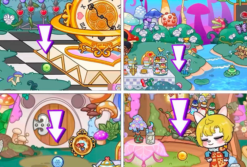 第三步,玩家在时钟左侧、疯帽客甜品餐桌右侧,还有密林小屋的门前和密林小屋的粉色小桌旁边,分别可以捡到绿、粉、蓝、黄四颗掉落的宝石,将这四颗宝石按照实充中央的图形暗示进行镶嵌,此时就可以成功触发四季切换效果,当时钟开始转动后就可以获得稀世宝剑了,拿上宝剑和盾牌。