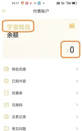 切换到付费账户页面以后,在【宇宙钱包】查看账户余额。