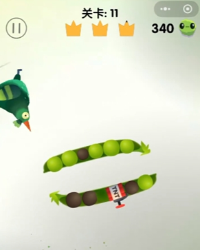疯狂的鸽子游戏第11关的豌豆荚中新增了炸弹,需在避开炸弹的同时啄掉全部青豆。建议开局从边缘青豆入手,并利用炸弹范围(约9格)集中清除豆群以提升效率。注意啄取黑豆中的虫子换取皮肤,最终以无失误操作达成三星通关。