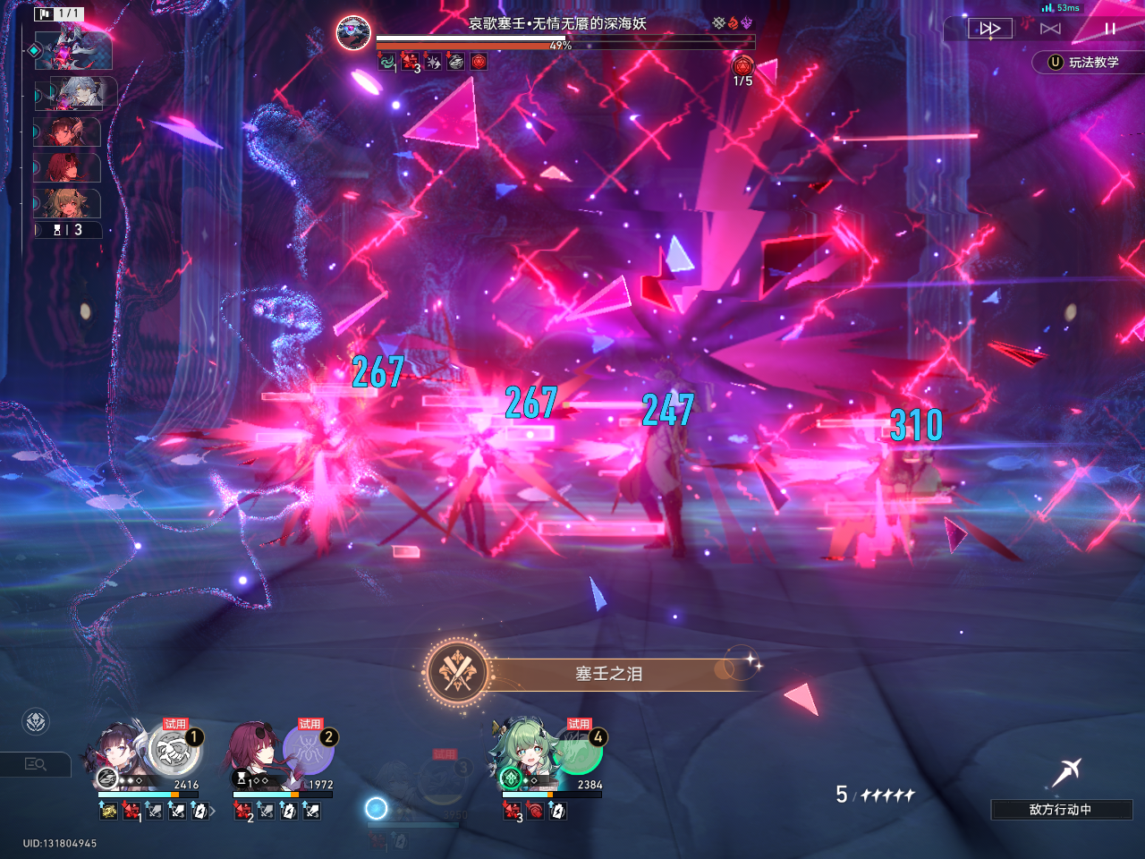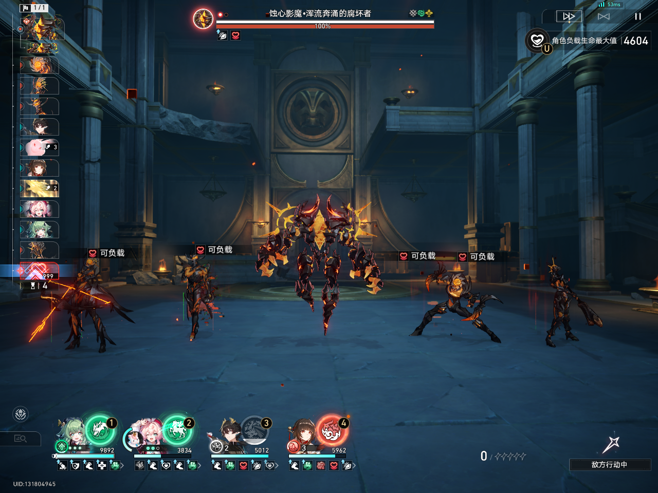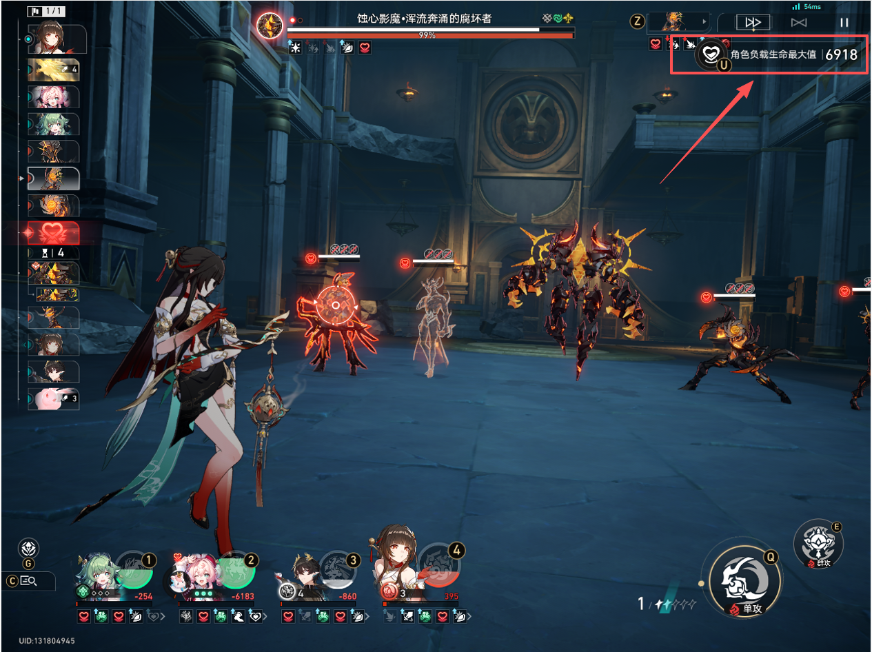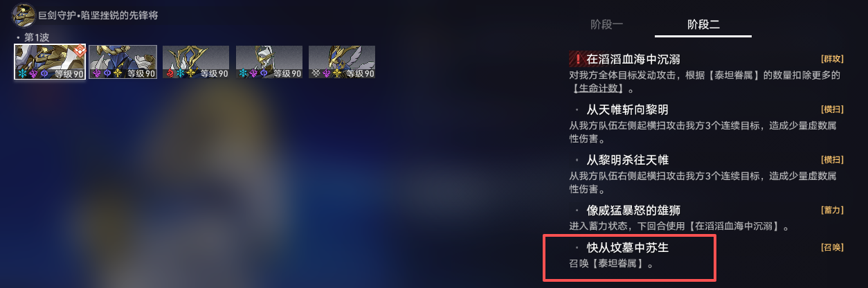 4、一阶段转二阶段BOSS新增一个大招(浑流奔涌),留生存位大招(风堇、灵砂、腾荒、白露等),在BOSS第一次攻击之后,释放大招【浑流奔涌】之前插队治疗避免角色[负载生命值]超过10000(成就需要8000以内)