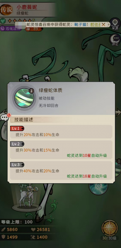 绿瘦蛇体质作为小鹿薇妮的基础增益,可以给她带来提升20%攻击和10%生命的数值提升,最多是小鹿薇妮蛇灵达到18星的时候,其中会得到的自动升级变成提升40%攻击和20%生命提升效果,所以这个被动其实在大家升星进行之后,一开始能够给小鹿薇妮带来的提升也不少了。