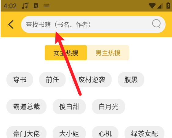 3、点击上方的搜索框,支持输入书名或作者进行查找小说。