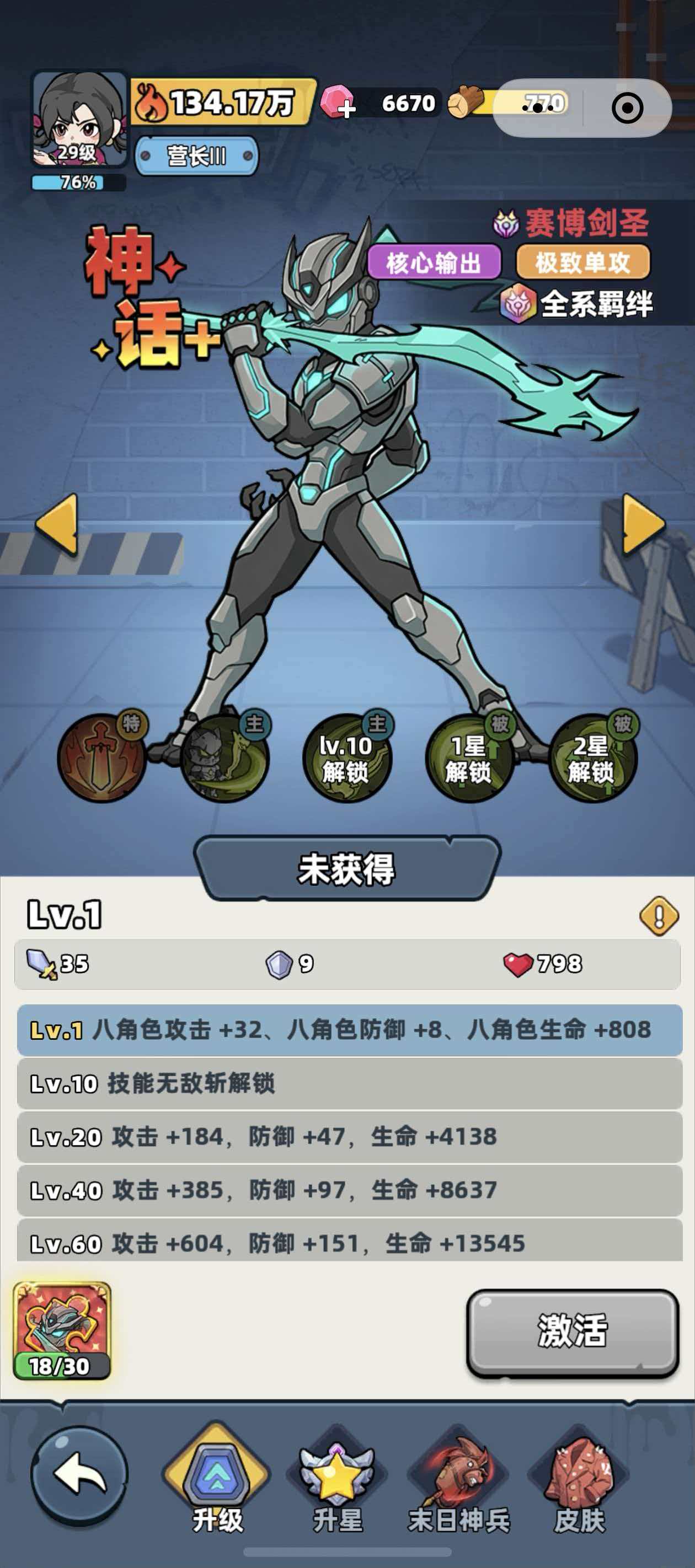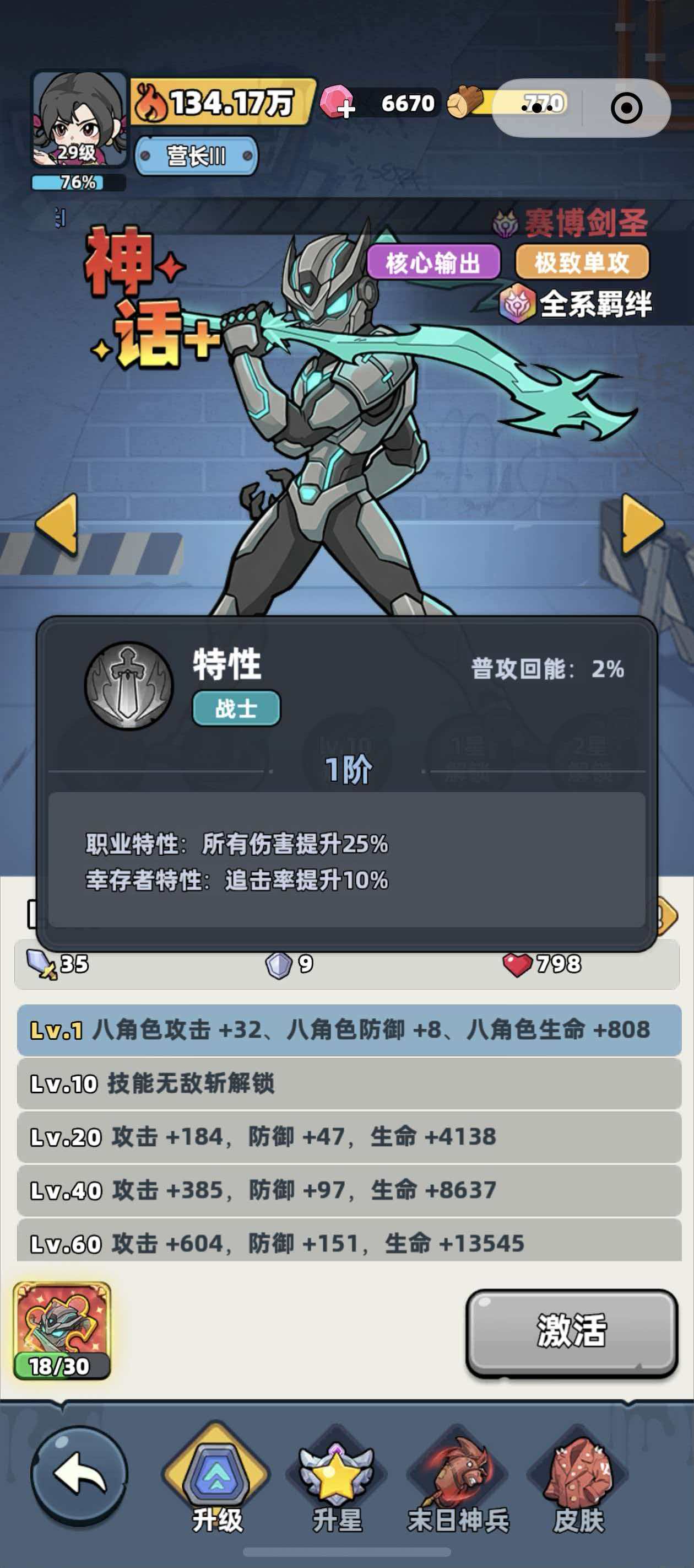 赛博剑圣在生存33天中是神话+品质的物理伤害为主的输出型角色,他还是一个全系羁绊的英雄哦,他的单体爆发能力非常的强,在众多爆发型的角色中,他的爆发能力堪称是极致的存在,在打boss中,给boss造成的伤害非常的高,切boss就像是在切菜一样,强大的战斗力,让他在推图的时候变得更为稳固。
