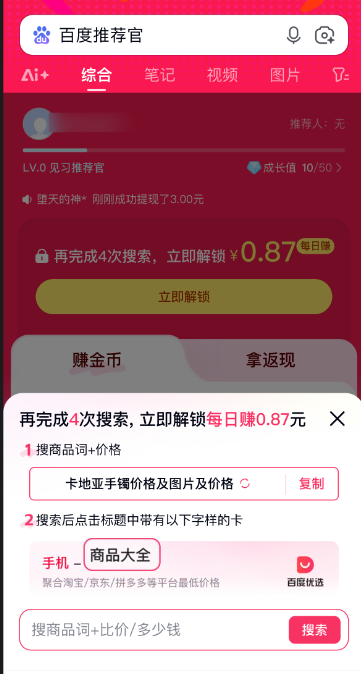 百度推荐官入口可通过点击指定链接或在百度APP内搜索“百度推荐官”进入。登录后,您可通过完成任务、邀请好友获得金币,累积后可兑换佣金并提现,实现轻松赚钱与购物返现。