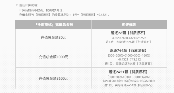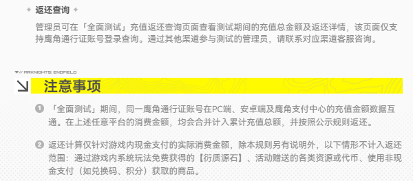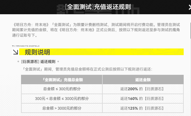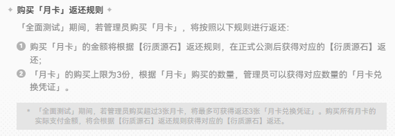 1. 「全面测试」期间,若管理员购买超过3张月卡,将最多可获得返还3张「月卡兑换凭证」。购买所有月卡的实际支付金额,将会根据【衍质源石】返还规则获得对应的【衍质源石】返还。