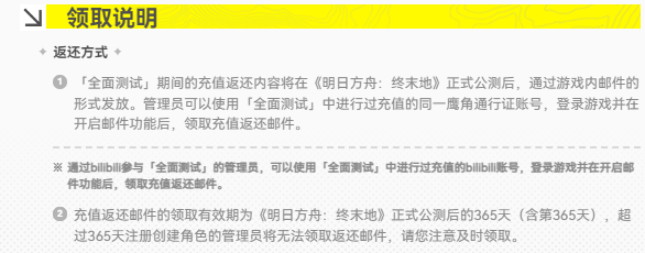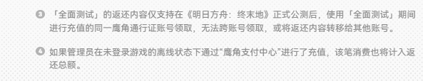 「全面测试」期间的充值返还内容将在《明日方舟:终末地》正式公测后,通过游戏内邮件的形式发放。管理员可以使用「全面测试」中进行过充值的同一鹰角通行证账号,登录游戏并在开启邮件功能后,领取充值返还邮件。