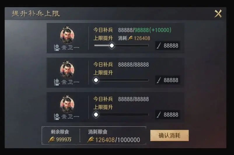 亲卫部队可上阵武将数量,随“扩营”科技等级提升而增加。部队间武将可进行置换操作,但主城部队与亲卫部队之间禁止直接交换武将;置换同时同步转移对应兵力。处于城外状态的亲卫武将,其行为规则与主城部队一致:出征后不可重置或拆卸战法,亦不可卸下装备。亲卫部队支持时间补兵,存在补兵上限;当多将兵力相同时,补兵速率一致;若兵力不均,则优先补充兵力较低者;可通过额外消耗粮食提升补兵上限。