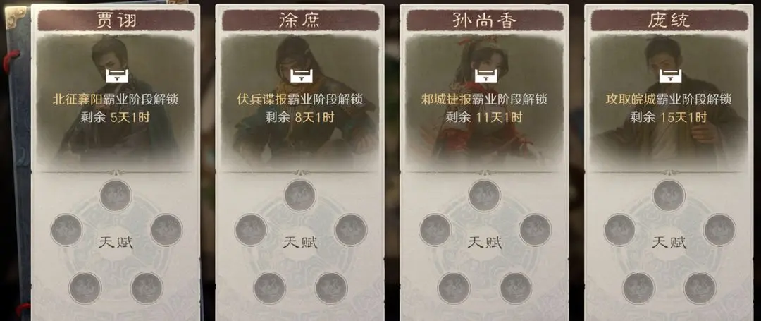 该系统面向特定武将开放天赋学习功能,初始可选定4名角色。武将解锁数量与玩家达成的霸业进度挂钩,逐步开放。已学习天赋的武将支持重置,冷却时间为2天;亦可消耗100黄金立即重置。天赋学习需使用武略点,每位角色初始拥有8点,后续需通过赛季进程逐步积累。所习得战法为角色专属,仅限该武将使用;学习期间该角色不可上阵。天赋衍生战法分为三类:影本、镜本、专精战法,均不可与原战法共存;且继承原战法当前品阶。