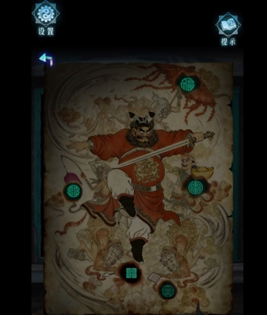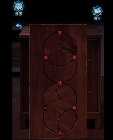 4、看看烛店架子上的册子,得知用敬神香烧画像的线索;再观察宗祠门上的机关图案线索结合两处线索,用点燃的敬神香烧画像的“伞、元宝、灯笼、毛笔、书”这5个位置,获得字符线索.