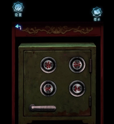 6、观察红色招牌上的字,以及画在旁边的箭头的角度;得知“恭、喜”二字需顺时针旋转,角度分别为:180⁰、90⁰;“发、财”二字需逆时针旋转,角度分别为:90⁰、180⁰,点击保险箱旋钮左侧,旋钮逆时针旋转;点击保险箱旋右侧,旋钮顺时针旋转;然后按照招牌上的旋转方向和角度旋转香烛店桌子下的保险箱旋钮为如图所示,打开保险箱.