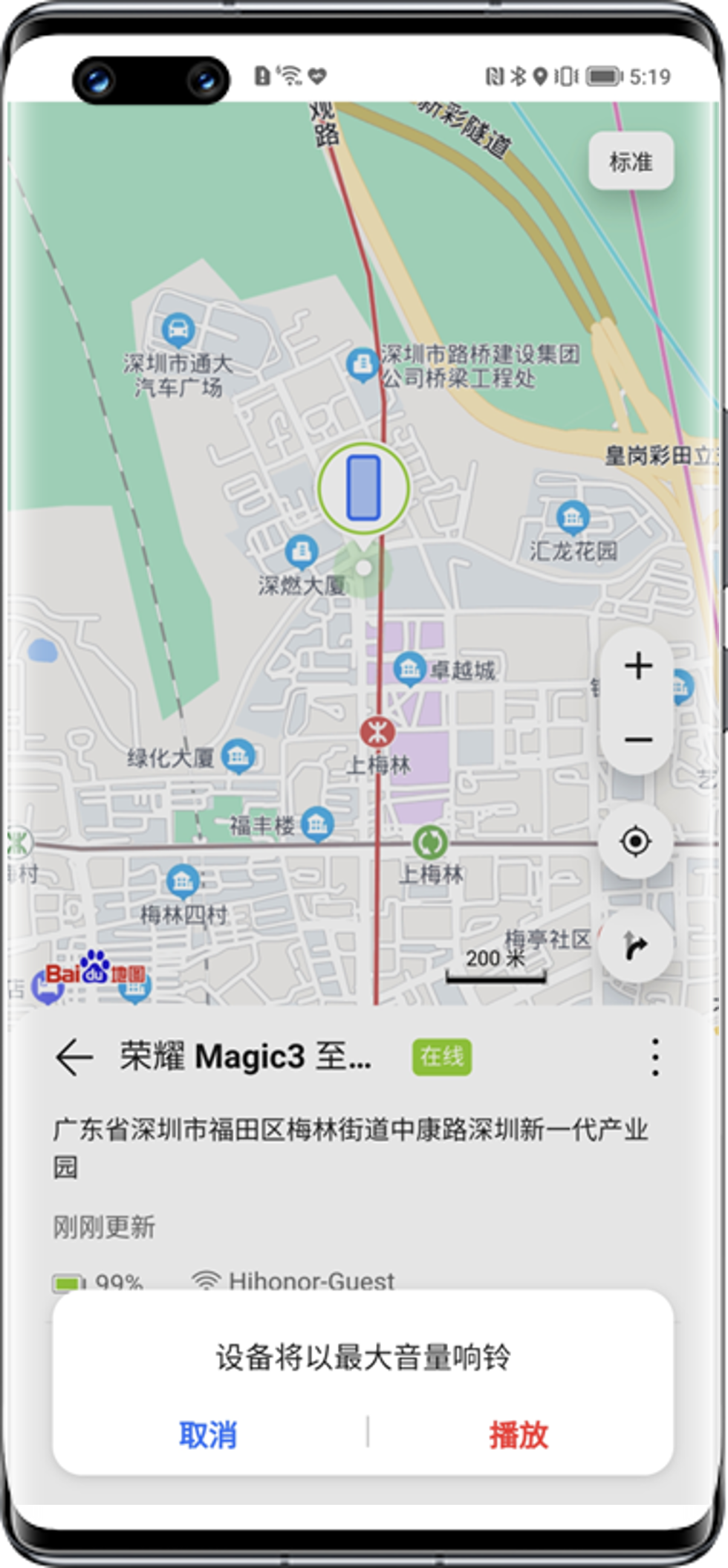 当定位显示设备就在附近:可以点击播放铃声,设备会以最大音量播放铃声,以便快速找到设备。