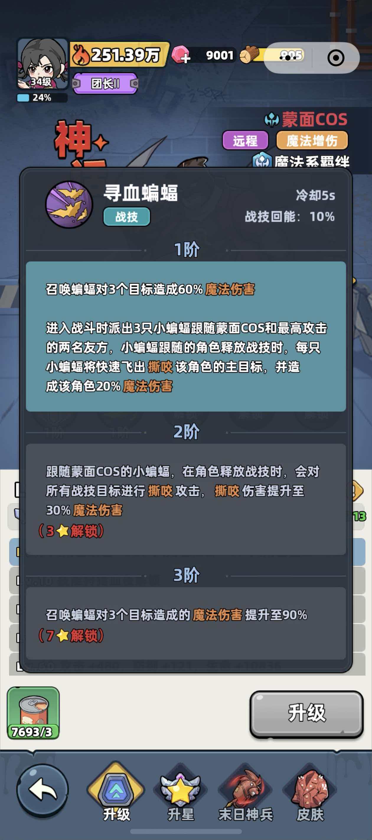 战技寻血蝙蝠是一个可以召唤出蝙蝠对敌人攻击的技能,该技能能够一次性对3名敌人造成60%的魔法伤害,进入战斗后蒙面cos可以召唤出3只小蝙蝠,跟随在自己以及队伍中攻击力最高的2名队友身侧,当角色释放战技的时候,小蝙蝠则会迅速的朝着敌人不断的撕咬,能够造成20%的魔法伤害。