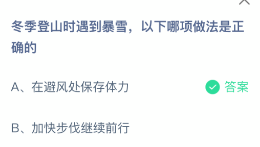 以上就是冬季登山时遇到暴雪,以下哪项做法是正确的?支付宝蚂蚁庄园2026年1月21日答案最新,更多相关攻略,请关注3dm手游网更新!