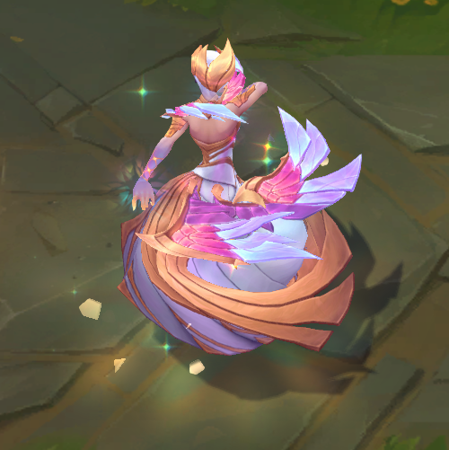 E技能,一开始手上金色的亮光,保护盾一点点出现,由玻璃碎片构成,护盾两侧有钻石和碎片环绕旋转,尖刺像是翅膀一样,消失时,玻璃碎片碎裂。