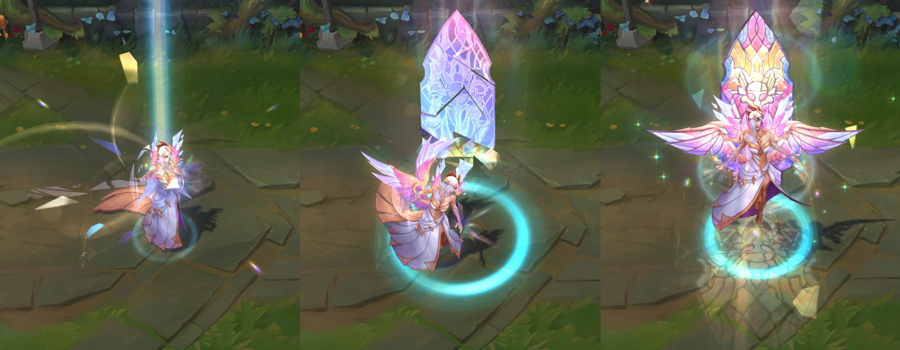 W技能,一把剑从天而降,地面上出现青绿色的亮光以及光晕,区域内是彩绘玻璃的图案,表面还会出现一些钻石。
