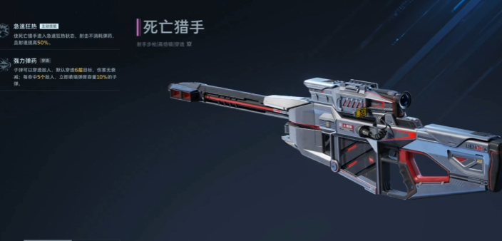 死亡猎手拥有着游戏中顶级的穿透能力,子弹射出后能够穿透最多6个敌人,并且对6个敌人的伤害都是一样的,极速狂热是它的主动技能,使用技能后射击不会消耗枪械的弹药,射速还会额外提升50%,在战斗接触到较多敌人的时候能发挥更强大的战略作用,单发子弹能一次性命中5个敌人后,还会获得额外的子弹伤害加成效果,战斗中能够越战越勇,使用增加暴击伤害的插件,能提升枪械的单发子弹伤害,使用增加换弹速度的插件,能提升战斗中换弹效率。