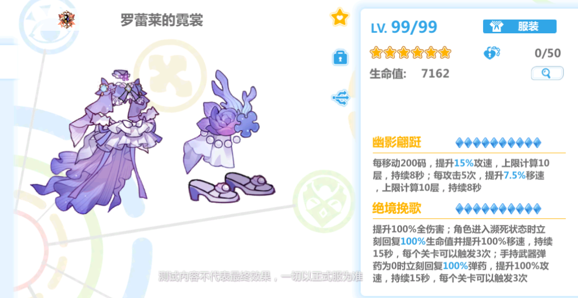 提升100%全伤害;角色进入濒死状态时立刻回复50%(100%)生命值并提升100%移速,持续15s,每个关卡可以触发3次;