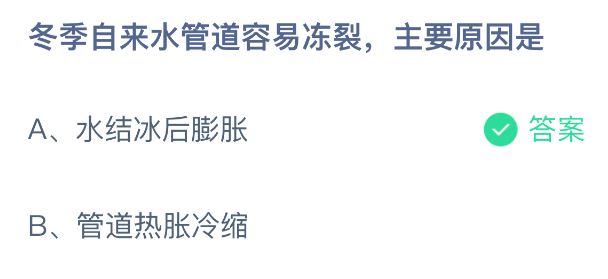 冬季自来水管道容易冻裂,主要原因是?支付宝小鸡课堂开课啦!每天花一分钟答题赚饲料,喂喂小鸡就能贡献爱心啦!轻松又意义十足!2026年1月23日蚂蚁庄园的小鸡课堂题目正确答案是【水结冰后膨胀】,自来水管在0摄氏度以下容易冻裂。冬天室外的温度低于0摄氏度时,自来水管中的水会结冰,由于冰的体积比水大,会对水管产生很大的压力,导致水管爆裂。