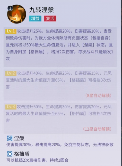 二技能在战斗开始时给我方全体添加一层凤羽效果,并对敌方全体造成一次伤害,当伤害可无视护盾,且给元凤对位的目标附加焚心,降低其受到的治疗效果,增加受到的伤害,风羽这个效果可以提升最终伤害,加强我方全体输出。被动技能除了提高攻击、生命和伤害之外,当元凤受到一次致命伤害时,为我方全体清除负面状态,同时自身还能复活,这样相当于多了一条命性,容错率非常高。