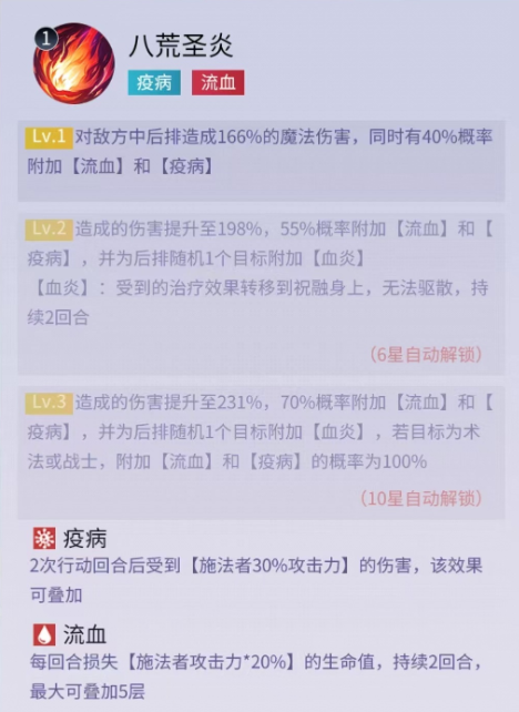 祝融的第一个技能八荒圣炎,在对敌方中后排造成魔法伤害后,有几率为其附加流血和疫病。流血每回合损失固定生命值,可叠加到5层,疫病是两次行动回合受到伤害,该效果可以叠加。这两个都是异常伤害流的佼佼者,现在叠加到一个人的身上,仅凭异常伤害这一点就可以打出很可观的输出。