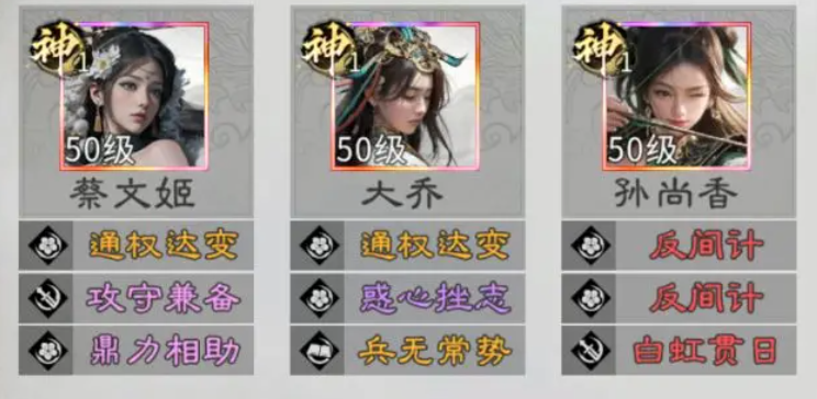 这里可以玩的就是孙尚香追击队这个阵容,孙尚香如果组合成功的话,其实带来的暴击数值很高的同时还可以带来多次追击,作为其中叠加的输出数值不错的武将,那么在这里达到这样核心能力的话,要用到最的角色除了孙尚香之外,大家还可以利用大乔跟蔡文姬的能力进行组合,这里可以说是双辅助的武将搭配,因为其中的增益效果通过蔡文姬以及大乔的组合可以带来足够的增益,这些增益施加给孙尚香的话,会让她的单体爆发能力更强势一些,而在这种效果上面要注意她能够达到的一个泛用性也是非常高的,因为后期大家不管是参与玩家对战还是参与也好,都是可以用到这个阵容,其中大家也要注意,在整体阵容上阵的时候双辅助是一定要的,因为这里三个角色,除了孙尚香有一定的追击次数之外,其他两个角色都是辅助,所以需要一定的防御数值。