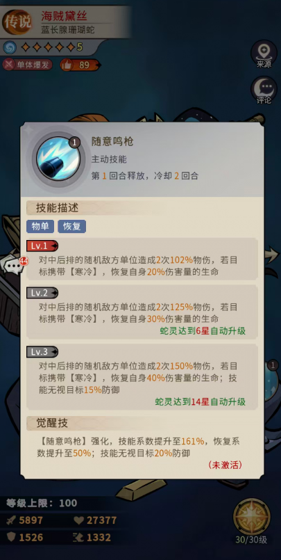 首先海贼黛丝的随意鸣枪技能是第一个主动释放的物理恢复技能,使用的时候可以对中后排的随机敌方单位造成2次连续的102%物伤,此时如果对面目标携带了寒冷状态的话,海贼黛丝则是可以恢复自身20%伤害量的生命,达到6星升级后的海贼黛丝对中后排的随机敌方会造成的是2次125%物伤,如果这个目标携带了寒冷机制的话,在上面可以恢复自身30%伤害量的生命数值,在达到14星的时候这里就会自动升级对中后排的随机敌方单位造成2次150%物伤,,此时根据目标是否携带寒冷状态,来给她自己恢复自身40%伤害量的生命,而且此时额外产生的还有一个技能无视目标15%防御的效果,大家通过这里能够用到的寒冷影响效果其实是可以持续实现吸血续航的,而且最后高星的时候带来的无视防御特性,也可以让对面的脆皮敌人没有办法抵抗