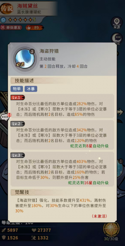 此时如果大家选中的这个目标生命数值是低于30%的话,则可以额外提升25%伤害,这里觉醒技海盗狩猎也可以因此来得到强化,技能数值在强化后可以提升到431%,而溅射伤害提升到180%,对30%生命以下的单位伤害则是提升到30%。另外一半使用的这个珊瑚蛇体质属于她基础的增益被动,提升20%攻击和10%生命,升星达到10星自动升级提升30%攻击和15%生命,后期高星级的时候会直接提升40%攻击和20%生命。