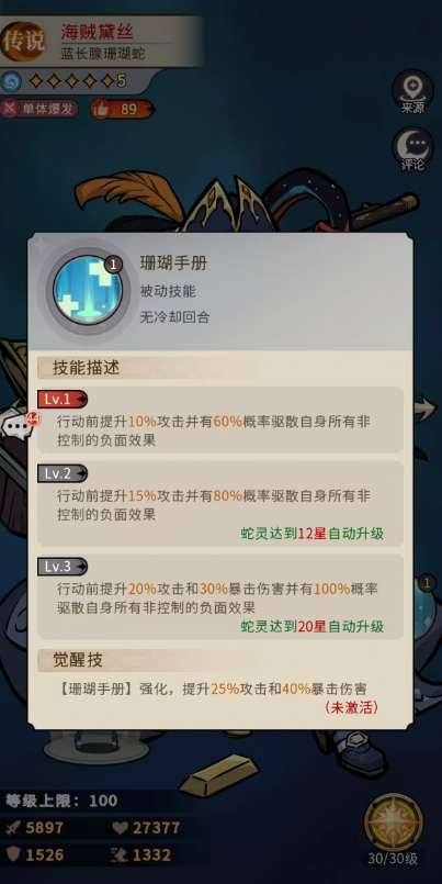 最后的珊瑚手册虽然也是被动,但是技能效果比增益好多了,这里只要是行动前触发的话,海贼黛丝就会有10%的攻击提升,并有60%概率驱散自身所有非控制的负面效果,所以这里的净化强度非常高,在达到12星这里的提升数值就达到了15%,还同时有80%概率来驱散其中所有非控制的负面效果,另外在20星的时候是可以升级行动前提升20%攻击以及30%暴击伤害,同时也还有100%概率驱散自身所有非控制的负面效果,这里大家利用她锁血必暴的一个机制加上前面的溅射扩散技能,其实是可以达成足够的完美的技能连携,而且在后期配合了必定的暴击能力之后,海贼黛丝绝对是可以避免被对面控制住的,毕竟这里她最后的一个技能是带有百分百净化的,同时只要大家会用爆伤其实这里的海贼黛丝是非常适合组成新手阵容的。