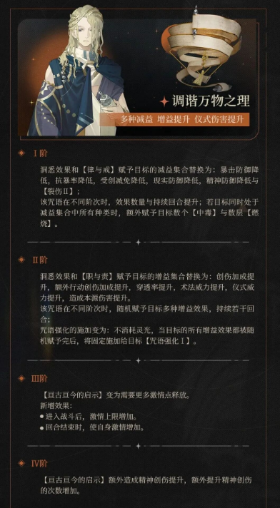 增益集合去掉了双防提升、痊愈1和反震1,新增了创伤加成、额外行动创伤加成、仪式威力和本源创伤提升。高阶2技能赋予的buff数量和持续回合提升。