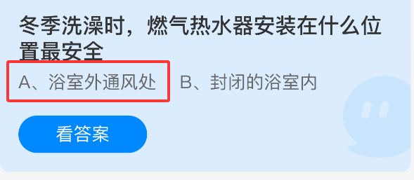 冬季洗澡时,燃气热水器安装在什么位置最安全?支付宝小鸡课堂开课啦!每天花一分钟答题赚饲料,喂喂小鸡就能贡献爱心啦!轻松又意义十足!2026年1月25日蚂蚁庄园的小鸡课堂题目正确答案是【浴室外通风处】,冬季洗澡时,燃气热水器安装在浴室外通风处。